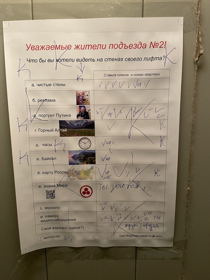 История произошла в пятницу 7.07. Зашел я в лифт своего подъезда и увидел следующую картину. В голове сразу возникло много вопросов. Что такое знамя мира? Зачем фотография Байкала в лифте в Новосибирской области? Почему Путин не набрал 147%? Но самый главный это какого черта ни один человек не прочитал как проголосовать и не поставил плюсик?! В общем вера в человечество в масштабах подъезда стремительно отрицательно выросла, но мне было очень интересно узнать какое решение будет принято старшей по подъезду на основании этой наскальной живописи. Решение не разочаровало:) Подъезд мой, тег «моё». Пост автора darkon4o. Комментарии к посту на сайте Пикабу.