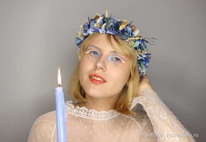 Здравствуйте! В данном образе для праздника мне захотелось соединить волшебство и нежность, воду и солнце. Поэтому я объединила персиковые цвета закатного солнца и голубой — цвет воды. Ивана Купала мистический и сказочный праздник, поэтому и макияж у меня получился фантазийным. Для макияжа я использовала: Rude The Roaring 20's Eyeshadow Palette — Carefree. Оттенки Bootleg, So keen, SwellMorphe 9L Lavendaze Artistry Eyeshadow Palette, оттенок Lilac love MISSHA M Perfect Cover BB CreamMAC Studio Finish SPF 35 ConcealerArt-Visage тушь для ресниц Chicago Very Peri 7days подводка для глаз B.COLOUR UVglow Neon PastelUnicorn Glow Color Squeeze Tint оттенок Chilly peach7days eye pencil neon 401 ColourPop Blue Moon Eyeshadow Palette оттенки Lumi, Moonlite, Fine ChinaLethal cosmetics Pressed Powder Shadow оттенок Allure Шаг 1: Нанесла базу под тени. Определила цветовые пятна и стушевала их границы друг с другом для плавного перехода. В уголок глаза Moonlite, на подвижное веко смесь из оттенков S