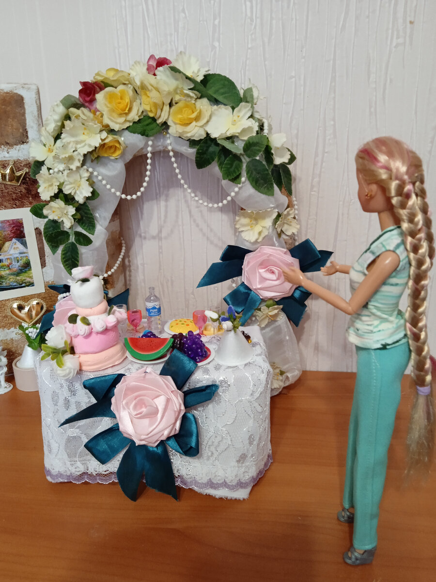 Сегодня долгожданная свадьба. К ней долго готовились все. И куклы, и я, и даже некоторые читатели. Вчера мы украсили кафе. А сегодня утром первыми приехали в кафе сестры, чтобы проверить, всё ли правильно стоит, приготовлено и оформлено. Но Мария, вновь обретенная младшая сестра, сказала, что так не пойдёт. Мария дизайнер. Она посмотрела и предложила кое - что поменять. Время ещё позволяло и сестры приняли её предложение. Она переставила свадебную арку и стол для жениха и невесты. Подготовила фото зону - это очень важно, поменяла тюль, добавила цветы. Получилось вот так. Листайте галерею. И вот он жених в ожидании своей невесты. Невеста пришла в пышном платье, с закрытым фатой лицом. Марк увидев её лишился дара речи. Она и так для него была самой красивой девушкой на свете, но тут он увидел самую красивую принцессу. Потом в зал вошли гости и артисты, которых уже приглашали на свадьбу Барби и Алекса. Были все пары друзья Аделии и Марка, и сестры Аделии. Не было только Дмитрия мужа Р