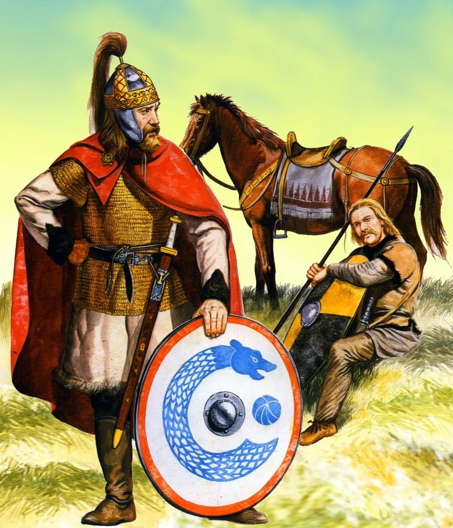 Так вот, древние германцы имеют центральноазиатское происхождение, поэтому конница древних германцев напоминает больше среднеазиатскую конницу тюрок, нежели коннницу западных тюрок булгар-сарматов. Те же шлемы с конскими хвостами, те же небольшие круглые щиты. Не забываем про икусственную деформацию черепа, это тоже очень важно!