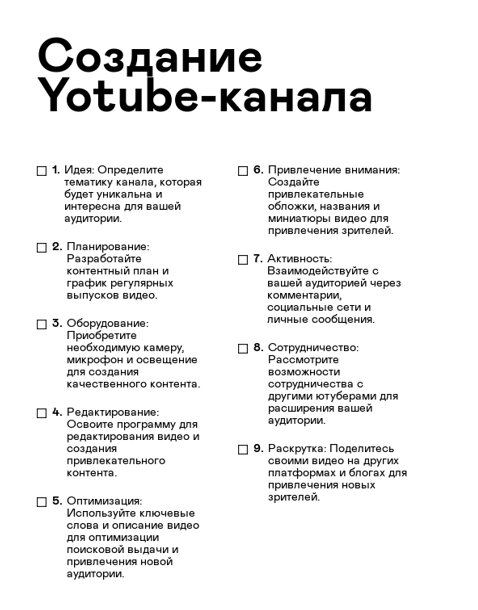 1. Идея: Определите тематику канала, которая будет уникальна и интересна для вашей аудитории. Выбор правильной идеи для вашего YouTube-канала является ключевым шагом к его успешному созданию. Подумайте о своих интересах, страстях и навыках, которые могут привлечь вашу целевую аудиторию. Изучите существующие каналы в выбранной тематике и определите, как вы можете внести свою уникальность.
