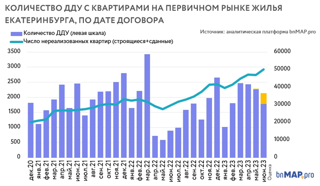 Тенденции: Рынок новостроек Екатеринбурга в 2023 году демонстрирует неплохие показатели реализации квартир. Ежемесячное число ДДУ превышает отметку в 2 тысячи квартир, что свидетельствует о высокой активности покупателей, характерной для 2021 года. Но быстрый рост продаж в начале года остановился, в мае-июне фиксируется постепенное охлаждение. Сокращение продаж в последние месяцы происходит на фоне быстрого роста рыночного ассортимента. Число нереализованных новостроек превысило отметку в 50 тыс. квартир и период активного пополнения рынка еще не завершен. При этом из 50 тысяч только 2,6 тысяч сданы в эксплуатацию, остальные находятся на стадии строительства. Выбор в сегменте готовых новостроек в последние месяцы сокращается. Рекордно высокий объем предложения не позволяет продавцам поднимать цены на все категории квартир. Практика адресного повышения соседствует и с корректировкой на отдельные типы квартир. Общий ценовой фон с позиции покупателей в текущем году сильно не изменился. Ци