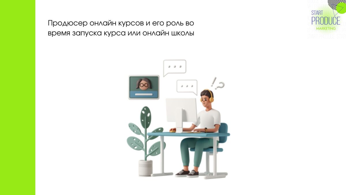 Продюсер онлайн курсов – это специалист, отвечающий за разработку стратегии запуска онлайн курса или онлайн школы. Так же его ролью является администрирование процессов запуска, постановка и контроль выполнения задач для других специалистов. Говоря другими словами, если вы разбираетесь в маркетинге, в ролях других специалистов и понимаете, как выстроить процесс привлечения вашей целевой аудитории к вам на курс, то можно эту роль взять на себя.