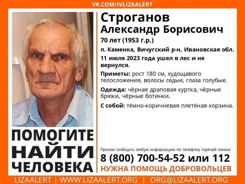 В поселке Каменка Вичугского района Ивановской области вчера, 11 июля, пропал 70-летний мужчина. В поисково-спасательном отряде “ЛизаАлерт” рассказали, что Александр Строганов ушел в лес и не вернулся. По факту пропажи сельского жителя объявлен выезд в лес. Штаб начнет свою работу 12 июля с 16:30. Форма одежды: лес по погоде. Добровольцы назвали приметы Александра Строганова. Рост мужчины 180 см, носит обувь, размер которой: 43, телосложение: худощавое, глаза голубые, волосы: седые, короткая стрижка Мужчина был одет в чёрную драповую куртку, чёрные брюки, чёрные ботинки. С собой: тёмно-коричневая корзина.