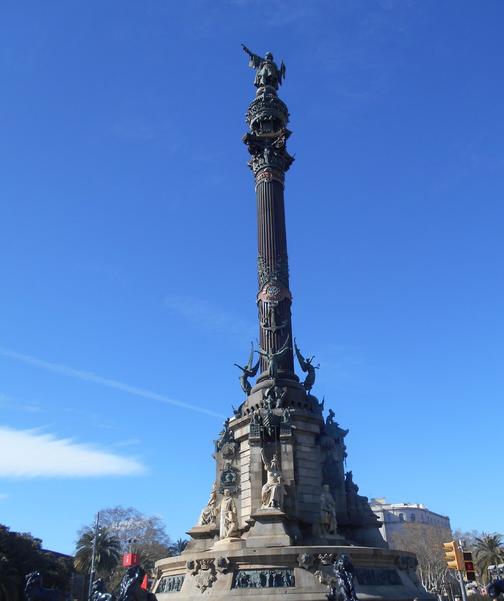 Яркая и шумная Рамбла, самая известная улица Барселоны, заканчивается небольшой площадью с красивым названием "Врата мира" (Portal de la Pau). Здесь возвышается величественный монумент, посвященный первооткрывателю Америки Христофору Колумбу, за ним начинается набережная Старого порта. Что же связывает Барселону и великого мореплавателя? Именно сюда, в Старый порт, Колумб вернулся в 1493 году из своей первой экспедиции к берегам Америки. Именно в Барселоне он посетил короля Фердинанда II и королеву Изабеллу Кастильскую, чтобы рассказать им об открытии новых земель. Спустя 400 лет, в 1888 году это историческое событие было увековечено грандиозным памятником, построенным к открытию Всемирной выставки. Семиметровая бронзовая статуя Колумба (архитектор Рафаэль Атче) венчает огромную колонну, общая высота монумента около 60 метров. Высоко в синем небе Барселоны самый известный моряк в мире в одной руке держит карту, а другой показывает на море. На постаменте памятника изображены события