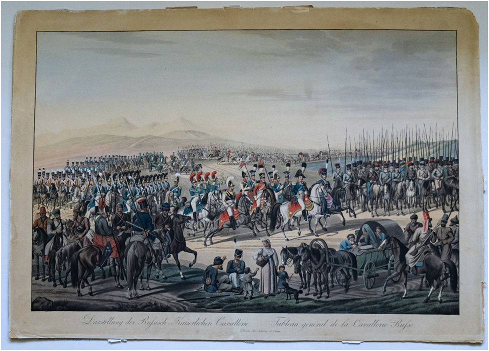 В центре гравюры двух генералов сопровождает почётный эскорт из представителей разных родов кавалерии – гусар в красных расшитых шнурами мундирах (доломанах), драгун в синих мундирах (цветовое искажение гравюры, должны были быть в зеленых мундирах), три улана в синих куртках и особых уланских шапках и два кирасира в белых колетах и кирасах. Далее следует эскадрон драгунского полка.