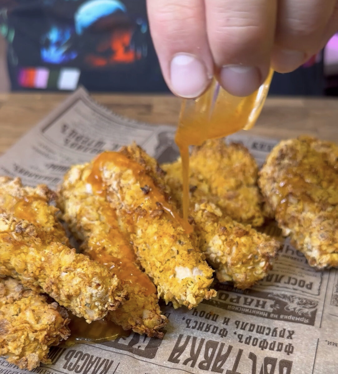 Такие стрипсы готовятся в духовке или аэрогриле. В аэрогриле получаются более хрустящие и менее сухие, но подойдет и духовка. Что важно, так это панировка - обязательно делайте ее на основе кукурузных хлопьев. И еще важный момент по поводу кукурузных хлопьев. Нужны именно неглазированные. Сейчас очень легко такие найти. 1. Куриную грудку режем красивыми полосками. 2. Взбиваем яйцо с небольшим количеством воды. Окунаем каждый кусочек курицы. 3. Для панировки берем неглазированные кукурузные хлопья и специи. 4. Запекаем при 200 градусах. В аэрогриле это максимум 10 минут. В духовке 12-15 минут. 5. Для соуса смешиваем жидкий мед, растопленное сливочное масло и острый соус. Поливаем стрипсы и наслаждаемся. Ингредиенты:куриная грудка 400гр, яйцо 1шт, кукурузные хлопья неглазированные 150гр + специи (соль и паприка по 1ст.л, базилик, чесночный и луковый порошок по 1/2ст.л, Чили и черный перец по 2/3ч.л). Для соуса 50гр сливочного масла, 100гр жидкого меда и острый соус по вкусу (у