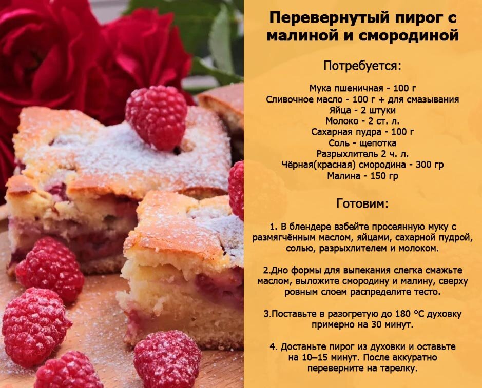 🍰 Перевернутый пирог с малиной и смородиной 🥗 Салат с малиной и шпинатом 🥠Вареники с малиной 🍧Йогуртовое мороженое с малиной