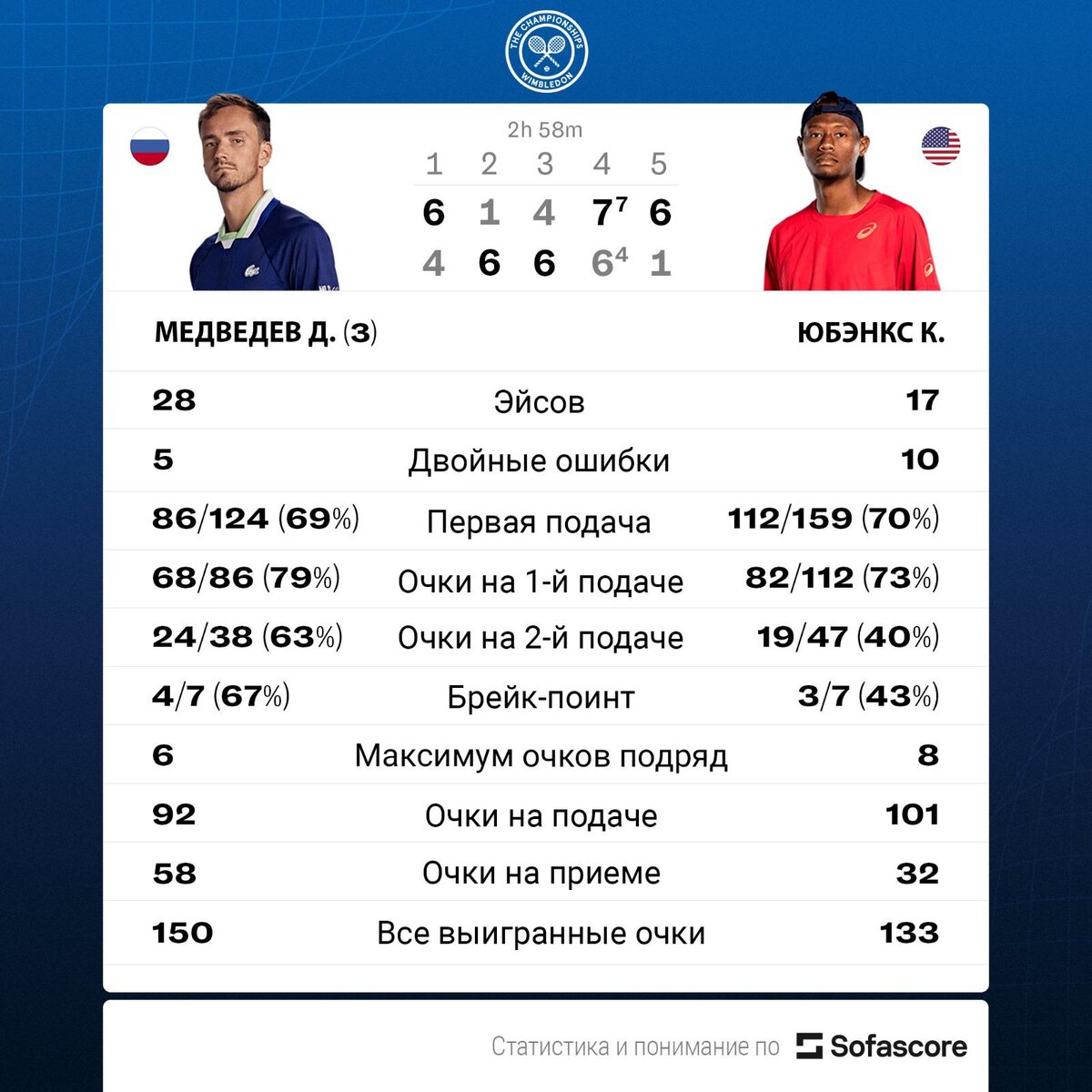 Российский теннисист Даниил Медведев вышел в полуфинал Уимблдона, третьего в сезоне турнира «Большого шлема». В 1/4 финала 27-летний россиянин, посеянный на турнире под третьим номером, победил американца Кристофера Юбэнкса, 43-ю ракетку мира, со счетом 6:4, 1:6, 4:6, 7:6 (7:4), 6:1. Встреча продолжалась три часа. Следующим соперником Медведева станет победитель пары Карлос Алькарас (Испания) — Хольгер Руне (Дания). Медведев является третьей ракеткой мира, на его счету 20 титулов ATP в карьере. Россиянин в нынешнем сезоне выиграл титулы в Роттердаме, Дохе, Дубае, а также на «Мастерсах» в Майами и Риме. На Уимблдоне он впервые в карьере дошел до 1/4 финала. Уимблдон завершится 15 июля. Общий призовой фонд турнира составляет £44,7 млн. Sofascore