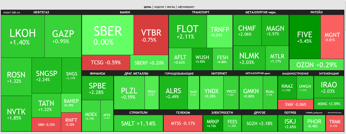 В зеленой доне сегодня аншлаг (ждем Регину Дубовицкую), X5 снова в росте, на сегодня рост составил 5,57%, ММК в плюсе на 2,77%, Сургутик префы подросли на 2,58%, НЛМК прибавили 1,80%, Роснефть 1,70%, НОВАТЭК 1,68%, Северсталь 1.57%.