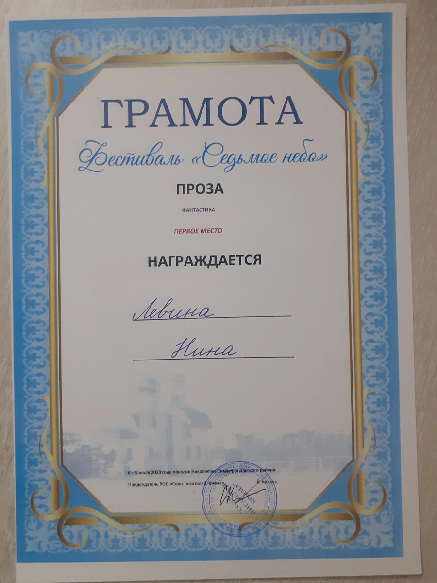 Дорогие подписчики и гости канала! Не могу не похвастаться радостным для меня событием. Второй год подряд я становлюсь победителем Всероссийского фестиваля "Седьмое небо" в номинации Проза, подноминации "Фантастика"! В этом году победу мне принёс рассказ "Маэстро"(как-то опубликую его на своём канале), а в прошлом - "Мыловар". Уже пять лет подряд фестиваль "Седьмое небо" проводится на Черноморском крымском побережье в посёлке Николаевка. На него съезжаются прозаики, поэты и барды не только из Крыма, но также из разных городов России. Организаторами фестиваля выступают "Союз писателей Крыма", в коем я состою, а также Николаевская администрация. Получается литературно-музыкальный праздник, после которого остаются незабываемые впечатления. Обычно фестиваль проходит четыре дня. Первый день - открытие фестиваля, второй день - проза, третий - поэзия, а на четвёртый - авторская песня и закрытие. Каждый вечер проходит "открытый микрофон", где любой участник фестиваля может выступить со своими