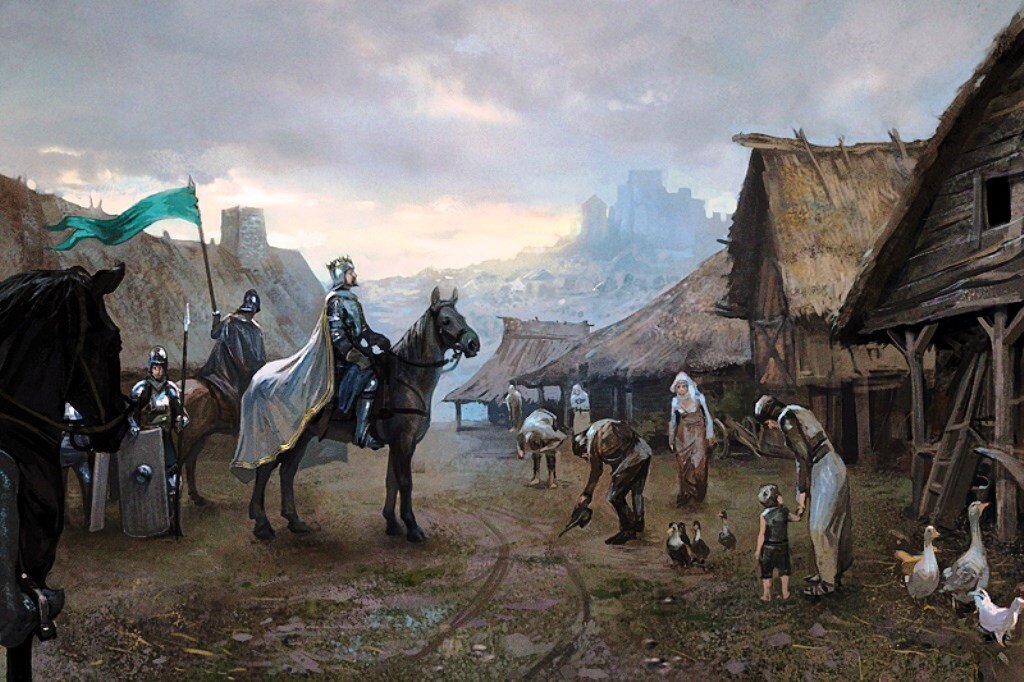 Там стояло несколько вооруженных всадников. Старший из них, закованный в блестящие доспехи, что-то грозно требовал от старосты, который стоял пред ним на коленях.