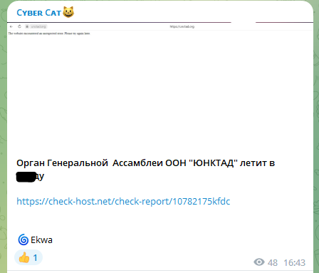Хакер Ekwa32 заявил в Тг канале(https://t.me/CyberCatHack/857) (https://t.me/CyberCatHack/858) хакеров Cybercat, что взломал 6 сайтов НАТО (не DDoS) и вывел из строя сайт органа Генеральной Ассамблеи ООН "ЮНКТАД" предоставив доказательства в виде скриншота ошибки и скрина чек-хоста. Веб-шеллы, как выразился хакер, пойдут на продажу, а сайт Юнктада поднимется в 17: 55 по Московскому времени, так как, по словам хакера, он до конца убедился, что безопасность ресурсов ООН ничем не выделяется от остальных его целей. У нескольких членов нашей команды. Во время проверки ресурса выдавал ошибку Connection, Timed Out и Web Server Down. К слову, большое отличие хакера в том, что он продаёт всю информацию, а не выставляет в открытый доступ, как многие группировки.