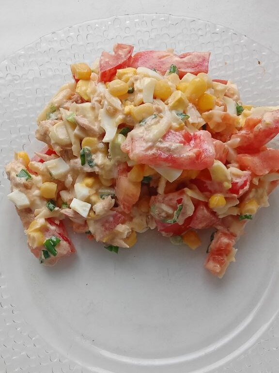 Для этого салата нам нужно: 1 банка тунца в масле 2 крупных розовых помидора 1 банка кукурузы 200 гр сыра 3 ст. л майонеза 5 варёных яиц Лук зелёный - 2 - 3 пучка Соль, перец по желанию (я не солю совсем) Лук и помидоры покрошить Тунец размять вилкой, сыр натереть на крупной терке Банку кукурузы открыть и слить рассол Яйца покрошить и добавить Немного майонеза, все перемешать и поставить в холодильник на часок. Салат готов! Подать к столу. Моим родным и друзьям очень нравится мой салат. Приятного аппетита! Сохраняйте себе, подписывайтесь на мой канал, будет интересно. Ваша Валентина.