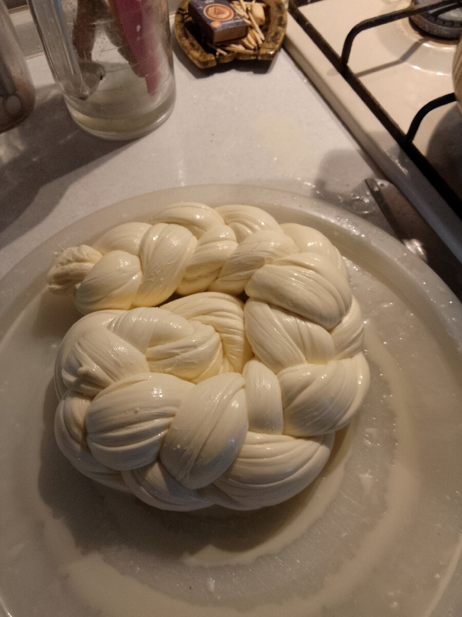 На пятый день после отела решила попробовать сделать вытяжной сыр, например чечил. Молоко ещё было не совсем молоко, а немного молозиво. Для повышения кислотности я внесла в холодное молоко лимонный сок. На 10 литров молока сок из половинки лимона. Далее все по схеме. Сгусток сформировался хорошо, плотный. Вымесила зерно, посолила прямо в сыворотке, откинула в форму и оставила на ночь в сыворотке для набора кислотности. Утром начала плавить сырную массу. Все пошло отлично, тесто тянулось, скручивались, принимало все желаемые формы. Вот и получился чечил. Надо сказать, что у меня совсем не сложились отношения с сухой лимонной кислотой , а вот с соком лимона все получается.
