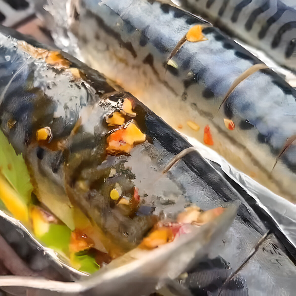Листья смородины Приготовление: 1. Зачищаем рыбу от внутренностей, промываем и делаем неглубокие надрезы. 2. Тонкими кольцами нарезаем лимон. 3. Для маринада смешиваем оливковое масло, белое сухое, соевый соус, чили перец и соль по вкусу, добавляем мелко нарезанный чеснок, и все перемешиваем. 4. Промазываем скумбрию маринадом со всех сторон. Их фольги делаем лодочки, на дно выкладываем дольки лимона, листья смородины и рыбу. 5. Отправляем на огонь и равномерно проливаем оставшимся маринадом. Готовим примерно 25-30 минут