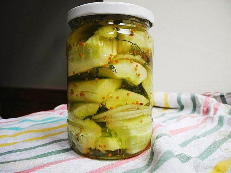 - -----КСТАТИ! В банки можно положить веточки укропа или лавровый лист - они придадут кабачкам дополнительный аромат. Но это уже по желанию.