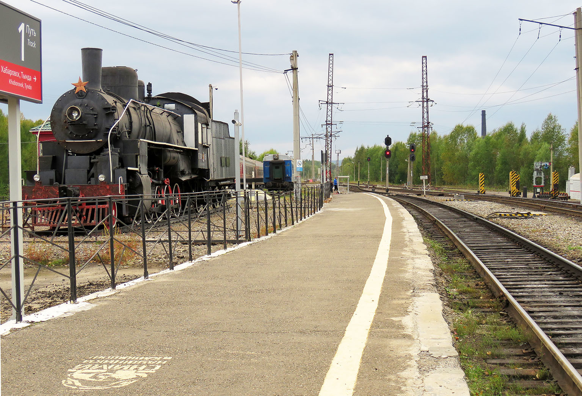 От станции Ургал за два десятка километров до Чегдомына сталинская стройка поползла "по трассе БАМа" на восток, и к 1953 году зэки успели выкопать тоннель под хребтом Дуссе-Алинь и проложить пути до его начала - всё это я показывал в прошлой части. О той эпохе напоминает теперь ленд-лизовский паровоз Еа с номером 2015, поставленный в 2016 году на перроне Нового Ургала: