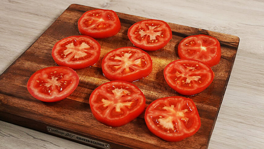Способ приготовления: Нарезаем помидоры кольцами. Вырезать мякоть помидора. Растительное масло добавляем в сковороду и добавляем сливочное масло. Кольца помидора выкладываем в сковороду. Нарезаем мелко мякоть помидора. Выкладываем в чашку. Нарезаем лук. Добавляем к мякоти помидора. Разбиваем яйца, добавляем к луку с помидорами. Добавляем щепотку соли и перца. Добавляем