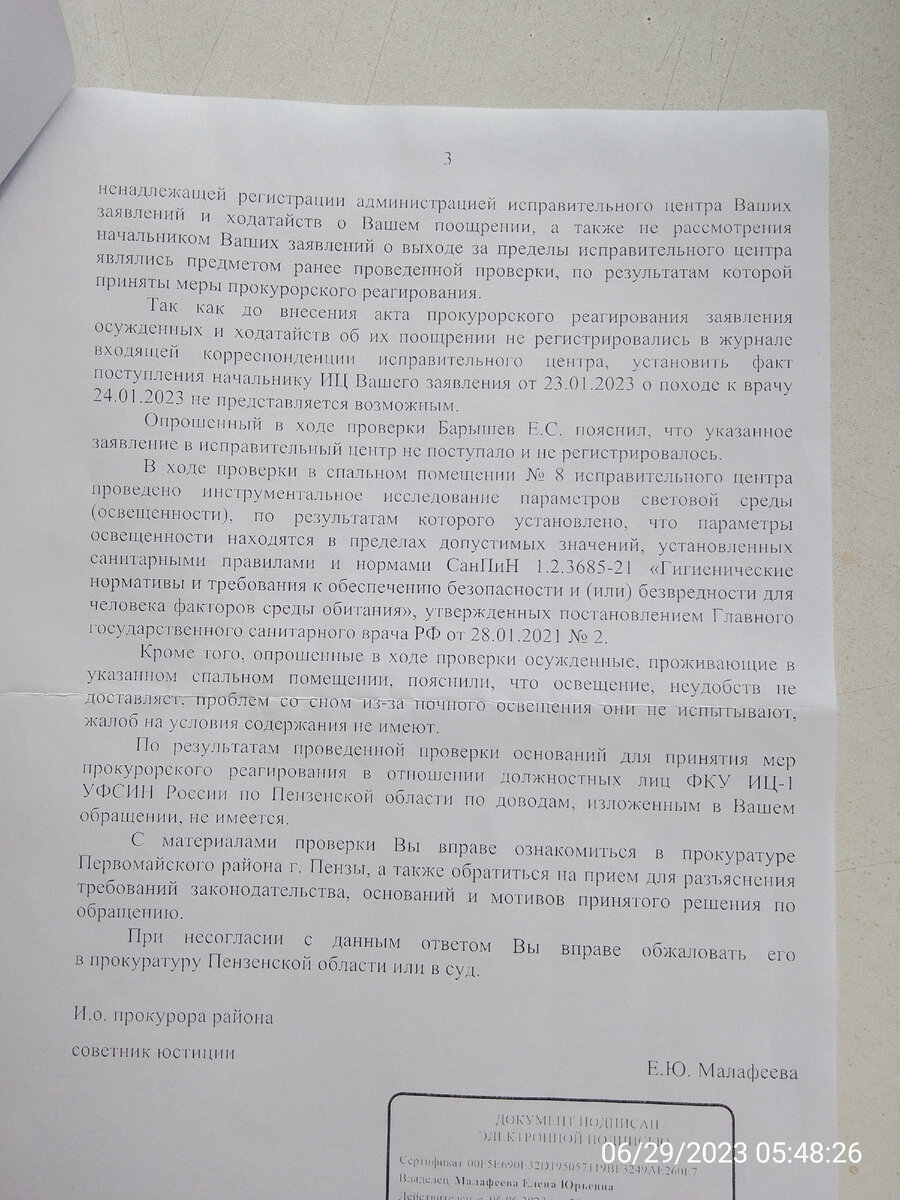 14.04.2023 года (спустя 10 дней, с момента визита Прокурора) в помещении номер 8, где расположенно мое спальное место, были установлено насколько яркое ночное освещение, что при нем можно было читать художественную литературу.
