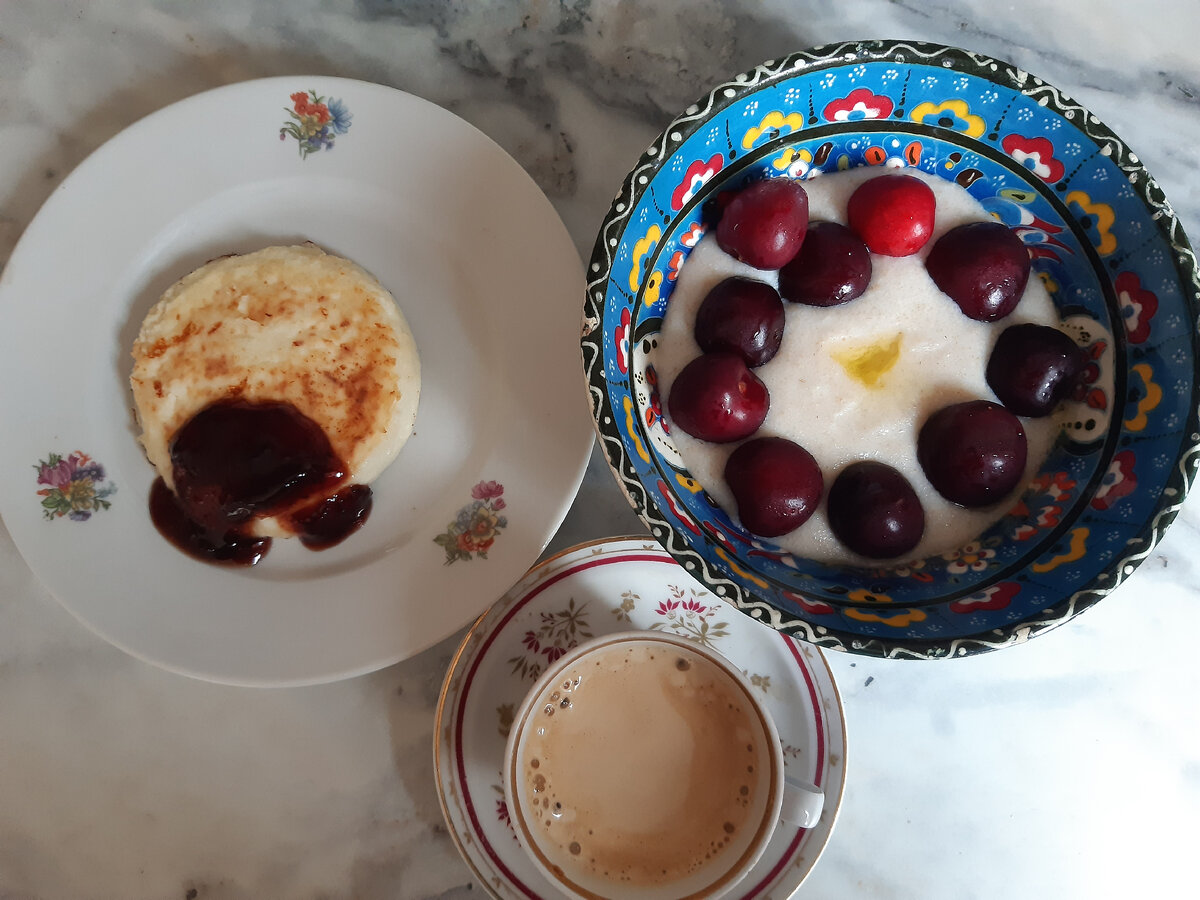 На завтрак сварила манку из полбы на молоке, в тарелки добавила топленое масло и черешню. К кофе - сырник со сливовым джемом.