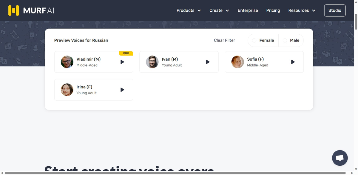 Murf.ai - это мощный онлайн сервис, решающий задачи в сфере голосовых технологий AI. Он обладает как ставшими уже классическими функциями по преобразованию текста в речь, так и более продвинутыми инструментами, которые могут изменять ваш голос либо клонировать чужой. На данный момент библиотека сервиса состоит из более чем 120 голосов (сгенерированы при помощи искусственного интеллекта) с поддержкой 20 языков мира (в том числе и на русском языке). Если вы занимаетесь созданием аудио для видео, озвучиваете фильмы, аудиокниги, видеорекламу и другие виды медиа контента, сервис может пригодится в подобных целях для использования. Более того, вы можете самостоятельно напеть мелодию и послушать, как она воспроизведется через устройство изменения голоса. Можно будет прослушать несколько типов голосов и подобрать подходящий. Сервис также может создать для вас индивидуальную голосовую модель. Весь процесс происходит в виртуальной студии. Здесь можно загрузить свой текст, выбрать для него подход
