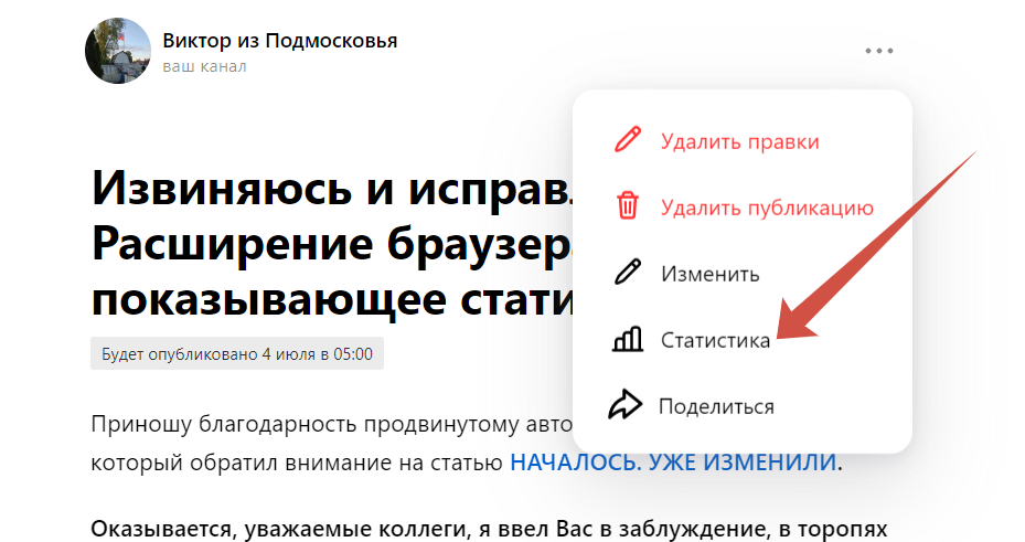 Итак, с 01 августа будем жить по новым критериям, определенным в Дзене. Но до этой даты еще почти целый месяц. А значит сегодняшняя статистика еще актуальна и важна. Будут новые форматы, будут и новые статьи, но уже про ОБНОВЛЕННЫЙ ДЗЕН. А пока имеем то, что имеем. Итак, одним из самых важных критериев в оценке публикаций, определяющих размер монетизации становится ВРЕМЯ ДОЧИТЫВАНИЯ-ПРОСМОТРА. Но уже сейчас можно отслеживать свои материалы и оценивать их эффективность. Инструмент для этого есть и в сегодняшней статистике на наших каналах. Кто не знает, объясняю: 1. Заходим в СТУДИЮ, затем в ПУБЛИКАЦИИ. 2. Жмем на интересующую нас статью. 3. Далее на три точки в верхнем право углу. 4. В открывшемся окошке выбираем СТАТИСТИКА 5. Получаем информацию о среднем времени дочитывания 6. Ну а цифру времени, затраченного на Ваш материал можете вычислить умножив среднее время дочитки на количество прочитавших (колонка слева). Итог получится не на 100% достоверный, но близкий. Так что теперь