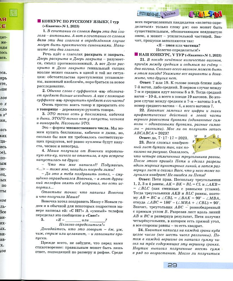 Под вот этой статьей читательница спрашивала, где искать ответы к конкурсу по русскому языку: Да, у Квантика есть конкурс и по русскому языку тоже. Мы выписываем этот журнал года три наверное, ребенок его очень любит. Вот нашла в 3 номере за этот год решения конкурса по русскому языку. Честно говоря, я не контролирую сильно, немного подсматриваю, что читает ребенок в журнале, но так понимаю, что почти все. А вот читает ли он разборы задач/олимпиад/конкурсов - спрошу. Я знаю только, что он это не очень любит, стремится решить самостоятельно, если сразу не получается, то потом возвращается.