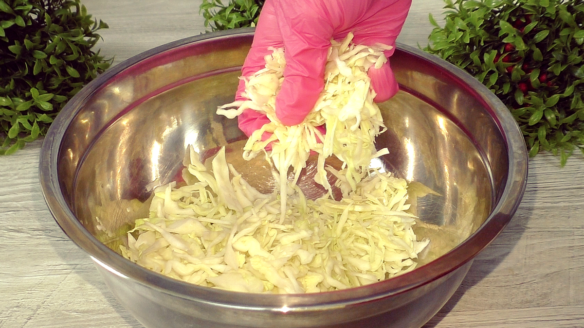 Зелень Капусту нашинковать и хорошо помять. Я предварительно капусту не отваривала, она получилась в готовом виде слегка хрустящая.