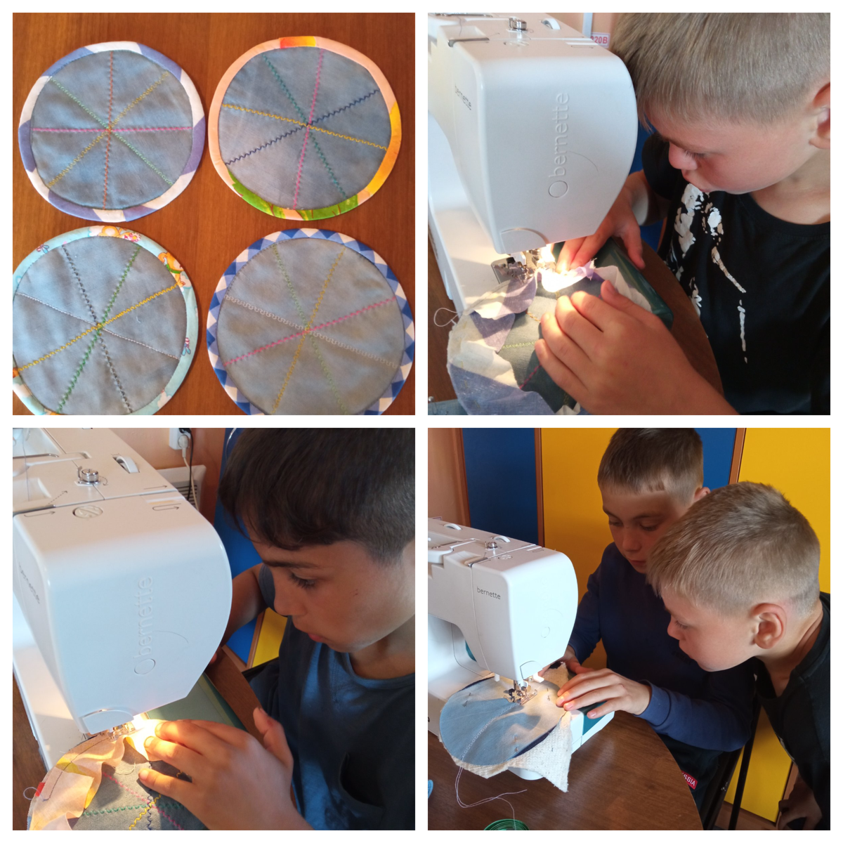 На занятии кружка "Умелые ручки" ребята приступили к изготовлению подставки под горячее из джинсовой ткани и хлопчатобумажного нетканого материала. Ребята с большим интересом выполняли отделочные швы на швейной машинке, меняли виды строчек, длину и ширину стежка, использовали нитки разных цветов.