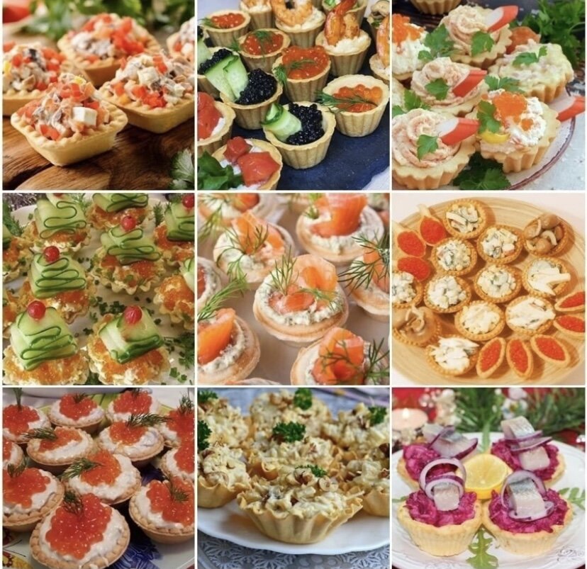 1. С творожным сыром Ингредиенты: 150 г творожного сыра; 1 зубчик чеснока или несколько веточек укропа; 15–18 небольших тарталеток; 100–150 г красной икры; несколько веточек укропа для украшения — опционально. ГОТОВИМ: Смешайте сыр с измельчённым чесноком или укропом. Распределите начинку по тарталеткам, а сверху разложите красную икру и, если хотите, веточки укропа. ⠀ 2. С курицей, грибами, яйцом и луком Ингредиенты: 500 г куриного филе; 3 яйца; 300 г шампиньонов; 1 луковица; 2 столовые ложки растительного масла; соль — по вкусу; молотый чёрный перец — по вкусу; 3 столовые ложки майонеза; 15–20 средних тарталеток; петрушка и маслины — опционально. Готовим: Обжаривайте шампиньоны на разогретой сковороде, пока не выпарится жидкость. Добавьте лук, масло, соль и перец и готовьте ещё несколько минут до румяности. Нарежьте курицу и яйца небольшими кубиками. Добавьте к ним остывшие грибы с луком. Заправьте майонезом и разложите по тарталеткам. При желании украсьте петрушк