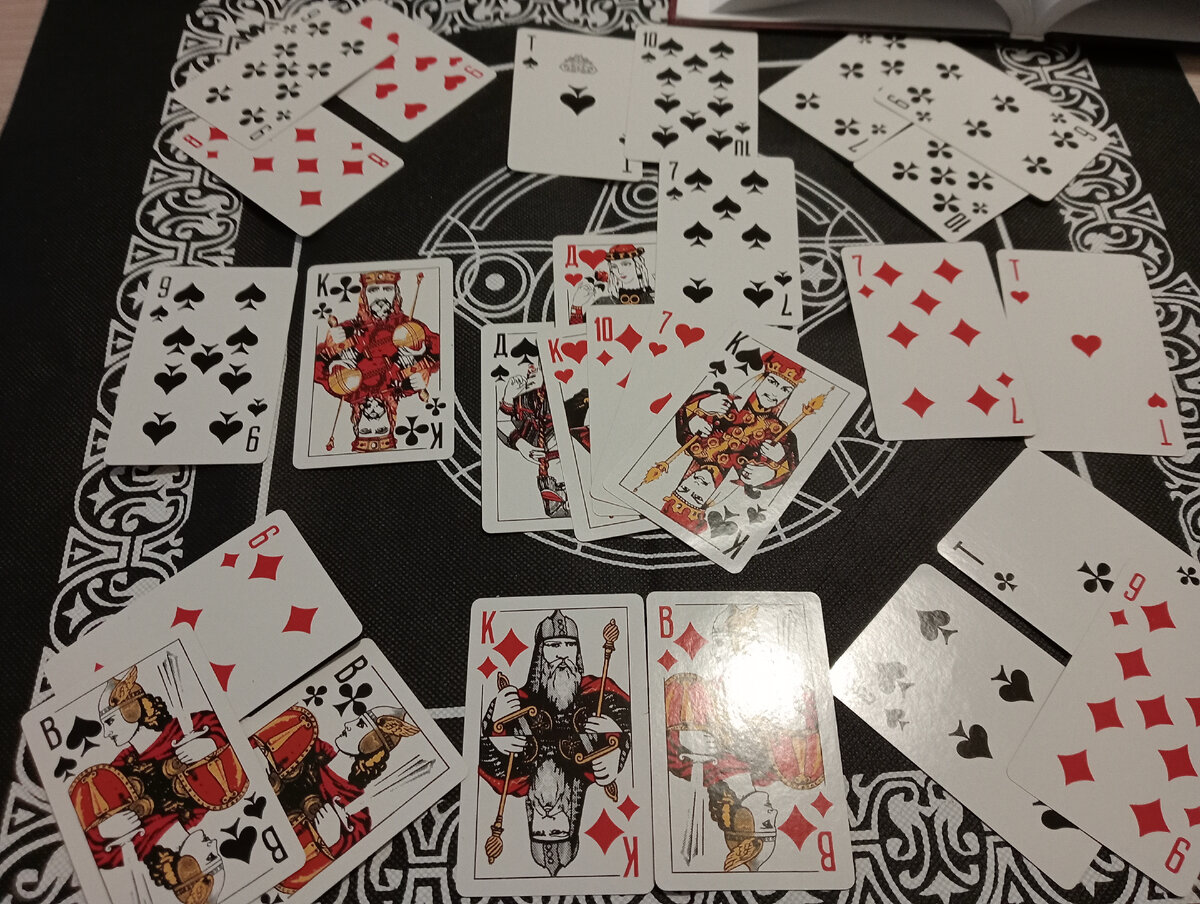 Карты читаются слева направо. В центре - карта человека, на которого гадают 1 это то, что находится на сердце, 2 - под сердцем (тайна) 3-4 - о чем думает 5-6 - на пороге ожидает 7-8 и 9-10 - настоящее 11-12-19 - далекое прошлое 13-14-20 - недавнее прошлое 15-16-21 - будущее (случится скоро) 17-18-22 - случится сроком в полгода. Снимаем с колоды по три карты. Пока не встретим клиента. Карты, которые рядом с клиентом ложим так, как показано в раскладе. Остальные по технике расклада, начиная с третьей карты. Когда выложили все карты по схеме, у нас остаётся ещё несколько карт в колоде. Оставшиеся от расклада карты, через три ложатся сверху на карту клиента пока не закончатся. Это карты, которые клиент держит на сердце. После того, как расклад завершили, начинаем читать сочетание карт. Для того, чтобы знать сочетание, необходимо рассмотреть значение каждой карты отдельно. Продолжение в следующем выпуске...🔥🔥🔥