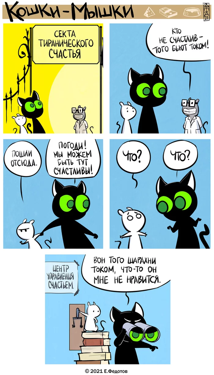 Счастье сложный предмет, вот оно есть, а вот уже нет. Сегодня у меня случился какой то странный день. Один из тех, когда вроде бы все хорошо, стабильная рутина, но не покидает ощущение предчувствия каких-то неприятностей. И раньше такое возникало, но неприятностей не последовало. Значит это обычная хандра, когда не хватает солнца и тепла. Или счастья? Решаю развеяться и погулять по блогам разных художников, чтобы посмотреть, в чем они находят счастье и как прогоняют прочь меланхолию. Начнем с малого, как можно сделать счастливым кота? Дать ему мышку! О, нет, только не в случае с героями комиксов российского художника Евгения Федотова. Он много лет рисует комиксы о приключениях черного кота и былой мышки. Его блог Кошки-Мышки| комикс набрал уже более 57 тысяч подписчиков, которые регулярно следят за тем, что может сделать счастливыми героев комикса. Хорватский художник-комиксист Мартин Рознер выбрал комиксы как легкий путь стать популярным и узнаваемым художником. Принесла ли известнос