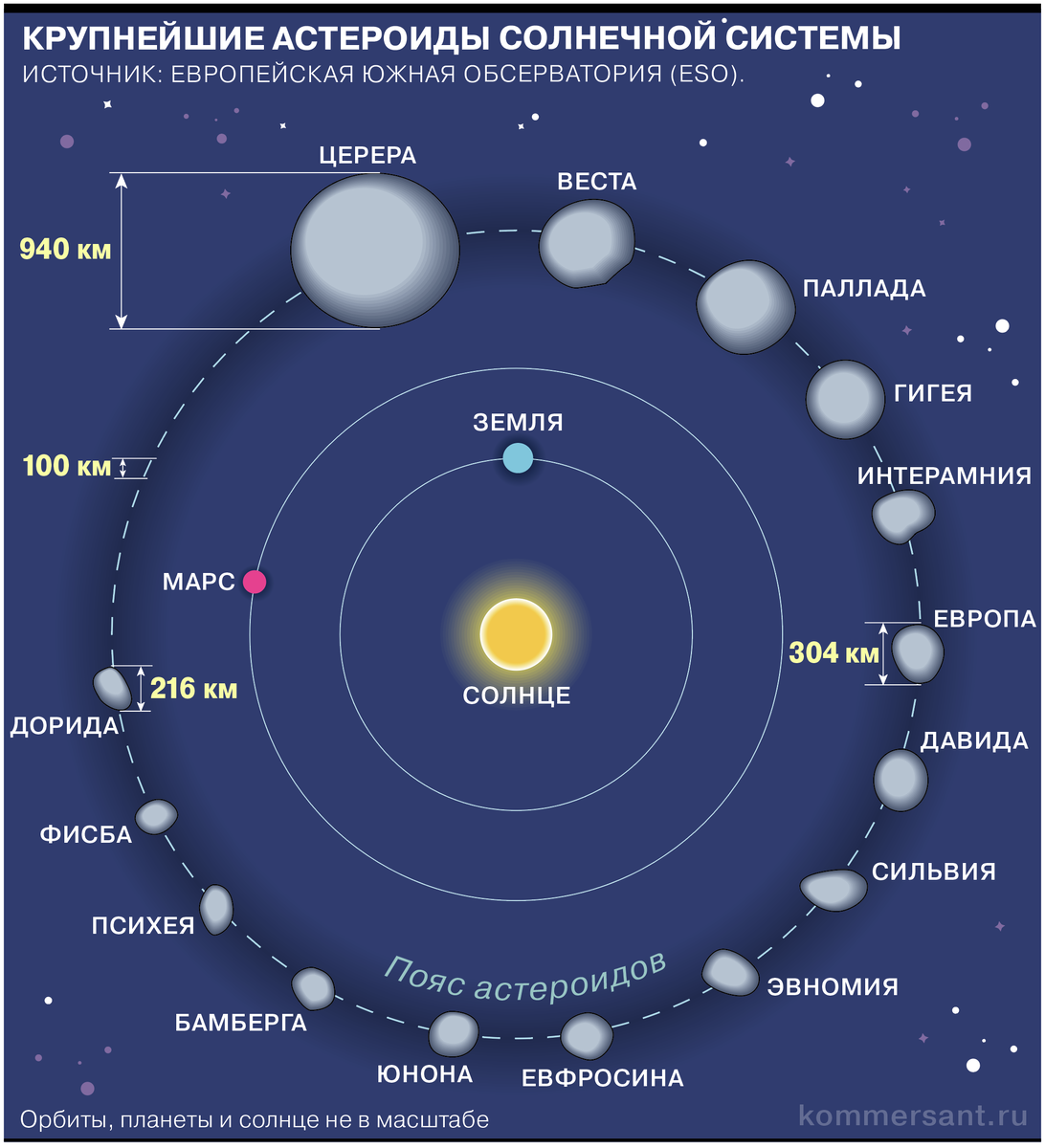 Крупнейшим астероидом является Церера, открытая в 1801 году итальянским астрономом Джузеппе Пьяцци. Ее диаметр приближается к 1 тыс. км. Благодаря своим размерам в 2006 году она получила статус карликовой планеты. Другие два крупнейших астероида, Паллада и Веста, имеют диаметр около 500 км. В общей сложности около 140 астероидов главного пояса из 100 тыс. имеют средний диаметр более 120 км, остальные значительно меньше.