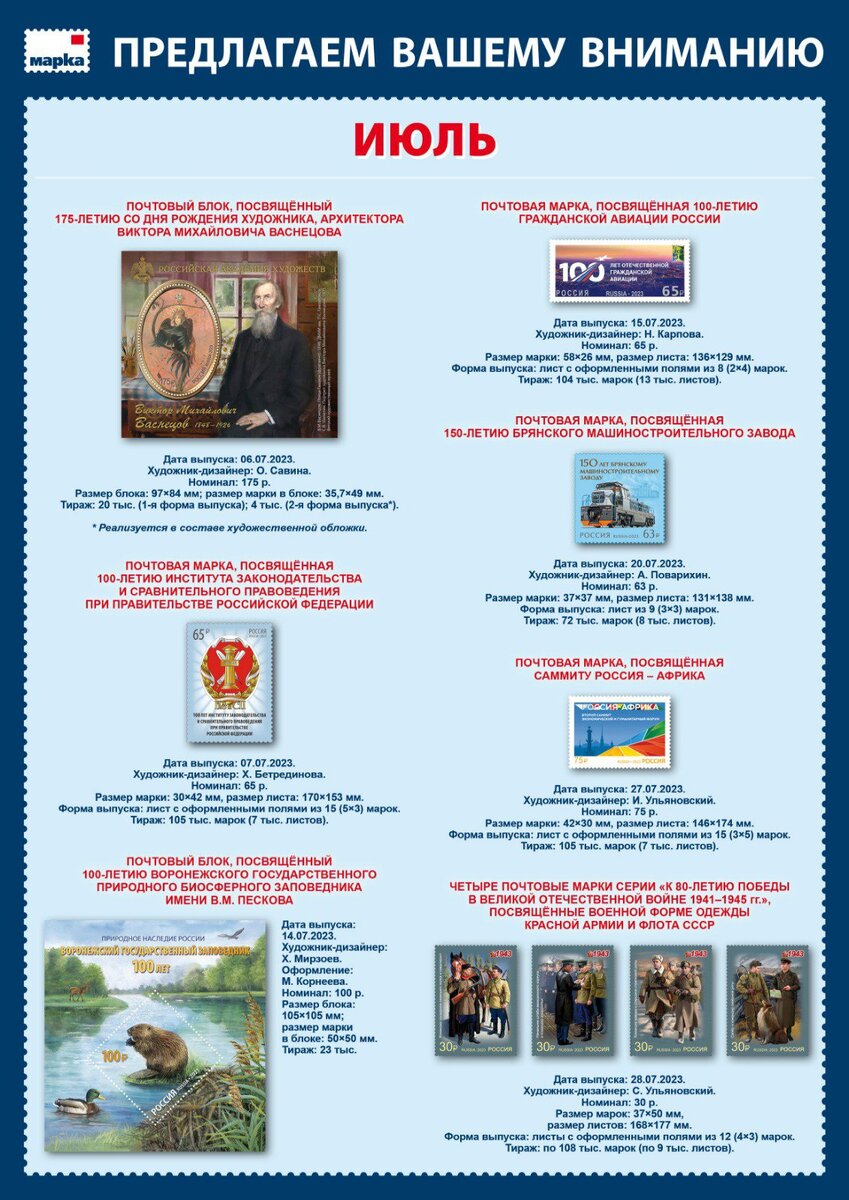 План выпуска государственных знаков почтовой оплаты за июль 2023 года.