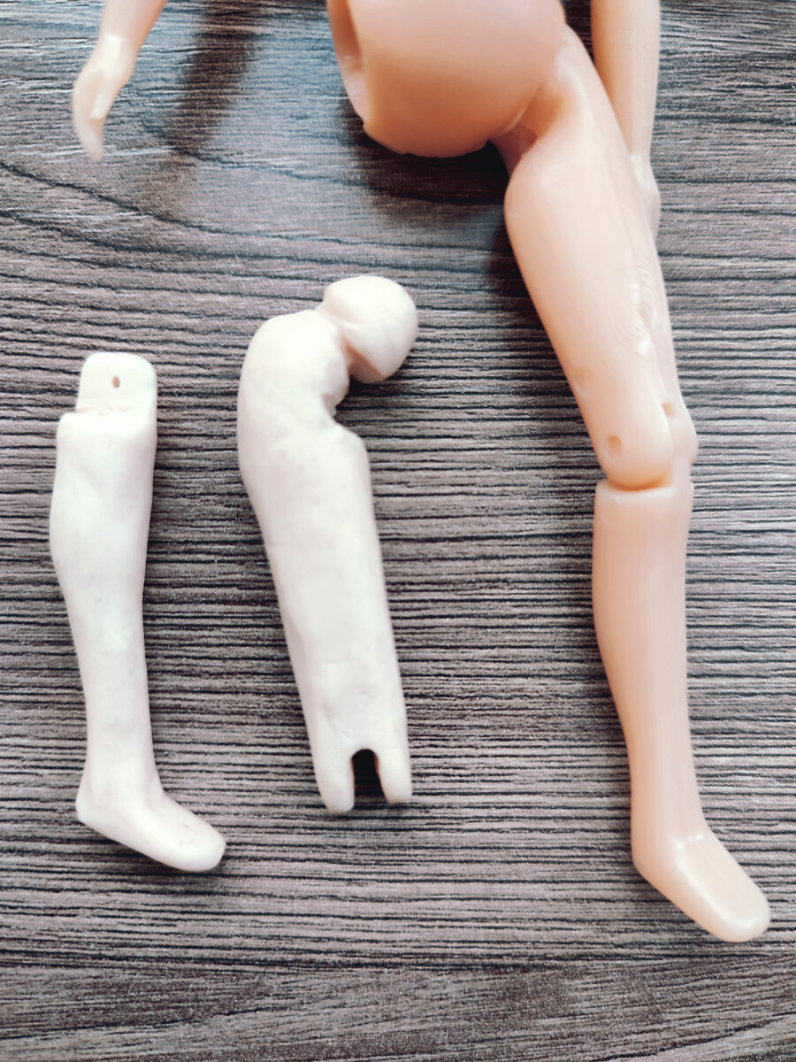 Речь идет о маленькой куколке из 90-х Памеле Лав. Мне она казалась похожей на "дочь Воландеморта". Если посмотрите на ее носик, точнее на его почти полное отсутствие, то поймете. Но, как оказалось, всего было 4 выпуска этих кукол компанией Simba, и они довольно сильно разнятся. Сглаженный носик у первого и второго выпуска, а в третьей версии личико стало более выразительным, хотя и менее нежным. Что ж, жизненно. Особое достоинство всех этих 16-сантиметровых крошек - прекрасные шарниры. А особый недостаток - ужасные волосы, которыми "славится" Simba. С учетом всего этого, куколка вызывала у меня интерес, но не более. Просто попался интересный вариант - выразительное личико (третий выпуск), сохранившиеся родные кудри и низкая цена за счет отсутствия одной ноги. Я почему-то сразу решила, что смогу сделать новую ногу Памеле, как уже делала новые ручки Гале. Запекаемая пластика телесного цвета как раз осталась от Гали. И вот запчасти в первом приближении: На самом деле бедренный шарнир у П