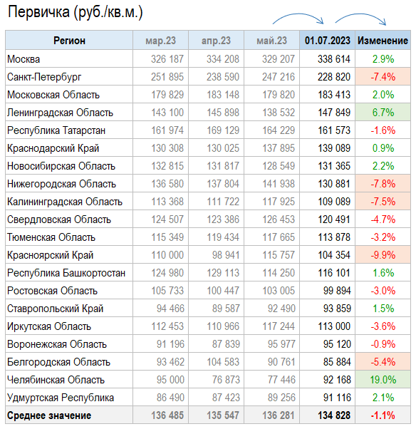 Первичка просела на -1.1%. Лидер снижения - Красноярск (-9.9%). Лидер роста - Челябинск (+19%).