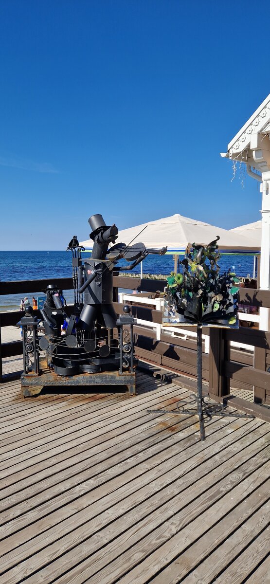 Добрый день. Сегодня расскажу о кафе Ам!бар, которое находится в Зеленоградске у самого синего моря))) Находится кафе по адресу: Зеленоградск, ул. Володарского,30. Из-за своей популярности и расположения рекомендую бронировать столики заранее, иначе рискуете не попасть. Или придется ждать у входа, как и случилось с нами, но нам повезло, одна пара уходила и ждали мы от силы 2 минуты. На входе встречают вот такие музыканты Как раз освободилось место на веранде с видом на море, где мы и обосновались. Конечно вид на море создает свое настроение и атмосферу Но подул такой прохладный ветерок, что хоть и можно было укутаться в плед, мы попросили,чтобы нас пересадили внутрь. Внутри помещение большое, также можно сидеть с видом на море, но в закрытом помещении у окна. Мы сидели глубоко внутри, посадка была полная. Заказали мы пиво и безалкогольный апельсиной пунш, суп с клопсами, Кенигсбергские клопсы с телятиной запеченные в сливочном соусе, которые подавались с картофельным пюре и цеппелины