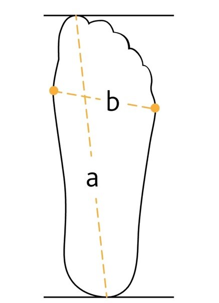 Для подбора колодки и расчета оптимальной ширины голенища нам необходимо знать как минимум 6 параметров: Длина стопы, обхват пучков, обхват подъема, обхват в зоне пятки ( косой), обхват икры, высота от пола до самого широкого места икры. Длина стопы. Для правильного очерчивания следа стопы нужно встать ногой на лист бумаги и, держа карандаш под углом 90 градусов к листу, обвести след всей стопы, кроме пяточной части. Пяточная часть обчерчивается под углом карандаша к бумаге 30-45 градусов. Измерение длины стопы производится от самого выступающего пальца к середине пятки. У кого-то это получится измерение по прямой, у кого-то чуть наискось. Измерение по этой линии и есть длина стопы (на рисунке это линия а). Обхват пучков измеряется сантиметровой лентой по самым выступающим точкам стопы по косой (на рисунке это линия b). Обхват подъема измеряется в самом высоком месте гребня стопы (рисунок d) Обхват в зоне пятки (косой) измеряется через середину пятки по точке сгиба стопы. (рисунок е).