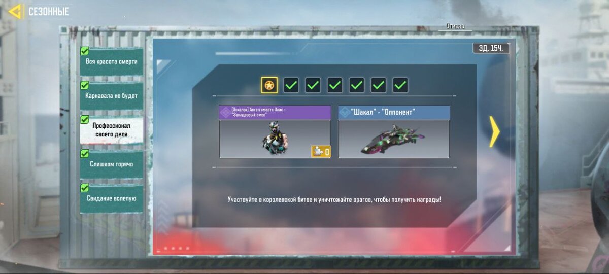 13 июня 2023 в Call of Duty: Mobile стало доступным для выполнения третье сезонное задание «Профессионал своего дела» главными наградами которого являются: осколки на эпического персонажа Ангел смерти «Элис» - «Закадровый смех» и редкий (синий) скин на транспорт «Шакал» - «Оппонент». Выполнение этого задания строится, прежде всего на игре в королевской битве с использованием различного боевого снаряжения и получения медалей. Задания простые, но времязатратные. Я прохожу эти задания на карте Затмение в режиме один игрок, если доступен турнир, то стараюсь проходить на Alcatraz. 1 этап заключается в следующем: необходимо 3 раза использовать микросхему класса в боях в королевской битве, самое простое задание, используем навык класса 3 раз и все, задание выполнено, можете для страховки еще улучшить фиолетовой микросхемой, когда найдете ее на карте. Награды 1 этапа: Кредиты внутриигровой валюты х300 и очки опыта боевого пропуска х2000. 2 этап заключается в следующем: необходимо заработать ме