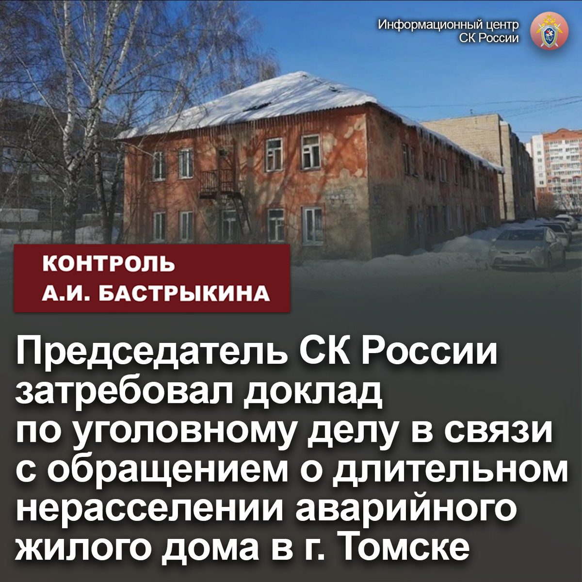К главе СК России А.И. Бастрыкину в его Приемную «ВКонтакте» обратилась мать ребенка-инвалида из города Томска. Она сообщила о длительном непринятии мер к расселению аварийного жилого дома по улице Ивана Черных в городе Томске. Ветхое здание признано непригодным для проживания и подлежащим сносу в 2014 году ввиду износа на 68% и возможности обрушения несущих конструкций. Несмотря на вступившее в законную силу решение суда, мер к восстановлению жилищных прав граждан до настоящего времени не принято.