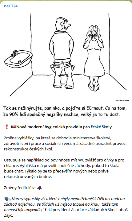 Только что чешский канал @neCT24 / 42TCen.cz сообщил радостную весть: Новые правила гигиены в чешских школах. Суть в следующем. Министерства школ, здравоохранения, социальных вопросов должны основательно облегчить эксплуатацию и реконструкцию чешских школ. В частности, отменяется необходимость иметь в школах отдельные туалеты для мальчиков и для девочек. Разрешаются совместные туалеты. Это касается как новых, так и реконструируемых зданий. Эти изменения директора приветствуют. – Новые нормы исключают те положения, которые не были наиважнейшими. В классах нет досок с мелом, поэтому там не должны быть умывальники, – сказал президент основных школ Любош Заиц. – Нигде не написано, что раздельные туалеты быть не могут. Всё будет зависеть от руководства школы, как они это объяснят. Если родители будут настаивать, нужно будет приспособиться, – высказалась депутат Рената Заичкова. Надо думать, что новые правила острому недостатку мест в школах не очень помогут, — заключается в статье. И вот ко