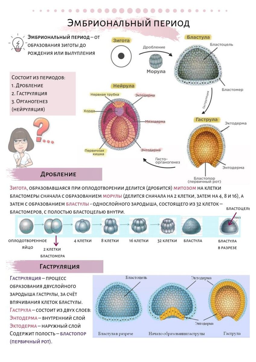 Эмбриональное развитие начинается с образования (при слиянии гамет) и дробления зиготы, которое происходит путем митоза. Деление клеток называется дроблением, так как в интерфазах между первыми митотическими делениями почти нет S периода (в котором происходит рост клетки), размеры клеток прогрессивно уменьшаются. Образующиеся в результате дробления клетки называются бластомерами. В ходе дробления сначала образуются 2 клетки, затем 4, 8 и т.д. При полном дроблении на стадии 32 бластомеров зародыш имеет вид ягоды малины и называется морулой.