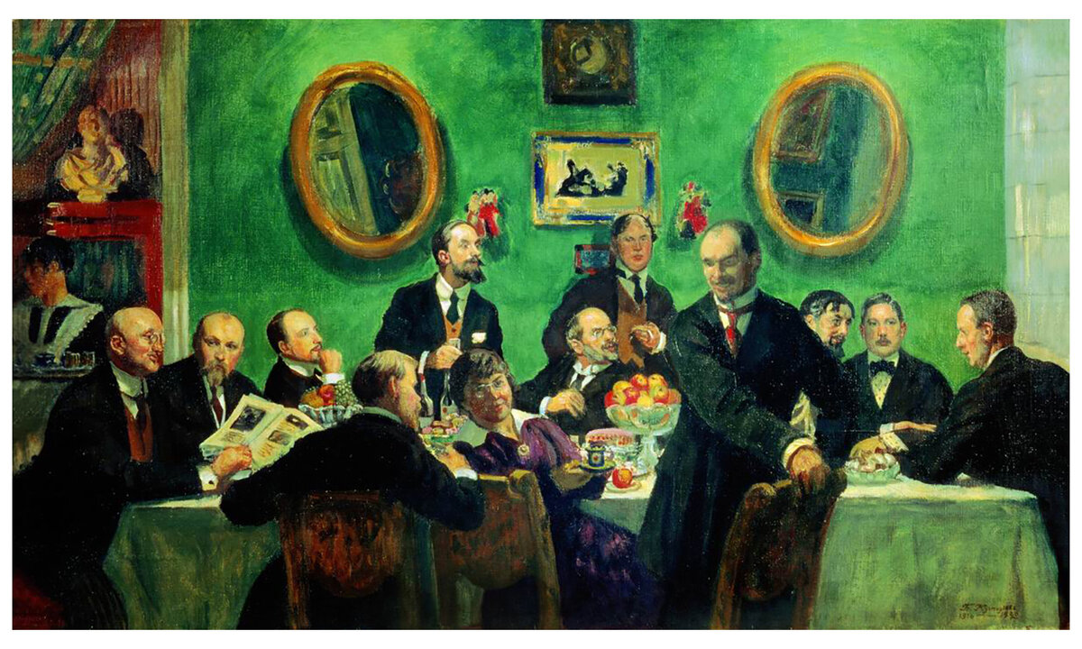 Это случится в 1905 году, когда перестанет выходить журнал, когда товарищество почти распадется, когда на них будет крошить французскую булку батон подрастающее и уже очень политизированное поколение и когда случится первая русская революция. Она же во многом их и разделит. Бенуа, главный идеолог сообщества — спрячется в Париже. Дягилев в Петербурге затеет сатирический журнал.