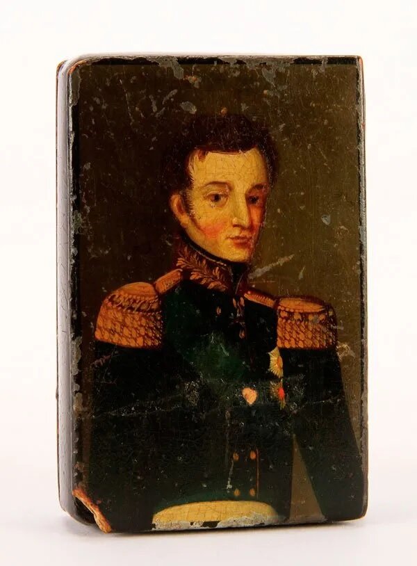 Очередной аукционный предмет с портретом. «Русская лаковая шкатулка, XIX в. Шкатулка с откидной крышкой, украшенная поясным портретом офицера с орденом Андрея». Да, несмотря на изменение цвета в связи с пожелтением лака, из-за которого она выглядит фактически зеленой, через плечо у персонажа надета, несомненно, голубая лента русского ордена Св. Андрея Первозванного. Старение лака сказалось и на цвете воротника изображенного, придав ему неопределенный оттенок. На самом деле воротник, конечно, красный, как и положено на генеральском мундире образа 1814./17 гг., который надет на персонаже. На левой стороне груди портретируемого условно, по-лубочному изображены две орденских звезды, а чуть ниже воротника можно исхитриться разглядеть белый крестик. Кто перед нами? Богатая «насмотренность», как выражаются искусствоведы, может сыграть в данном случае дурную шутку и побудить «увидеть» на портрете генерала Ивана Федоровича Паскевича. А что? Физиономически у достаточно примитивного портрета с к