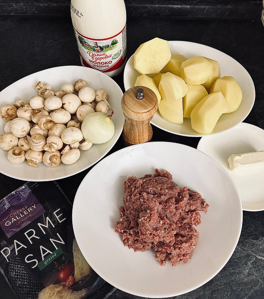 Ингредиенты на 6 порций : Картофельная запеканка - простое блюдо , которое отлично подойдет как на обед, так и на ужин для всей семьи. Легкость приготовления и доступность ингредиентов так же очень радует. Приступим ) ✔️ Первым делом, нам необходимо приготовить картофельное пюре, для этого чистим картофель и отправляем его вариться до полной готовности. ✔️ Пока картофель варится , подготовим остальные ингредиенты: займемся фаршем и грибами. Фарш у меня полностью готовый, со всеми специями , в составе уже имеет репчатый лук, если у вас фарш без приправ, то его необходимо довести до готовности, приправить необходимыми пряностями и специями по вкусу. Затем обжариваем его до золотистого цвета на сковороде, смазанной растительным маслом. Это займет не более 5 минут. ✔️ Грибы режем пластинками , лук репчатый - мелкими кубиками. Отправляем так же на сковороду, смазанную растительным маслом: сначала лук обжариваем до золотистой корочки , затем добавляем грибы, обжариваем все до готов
