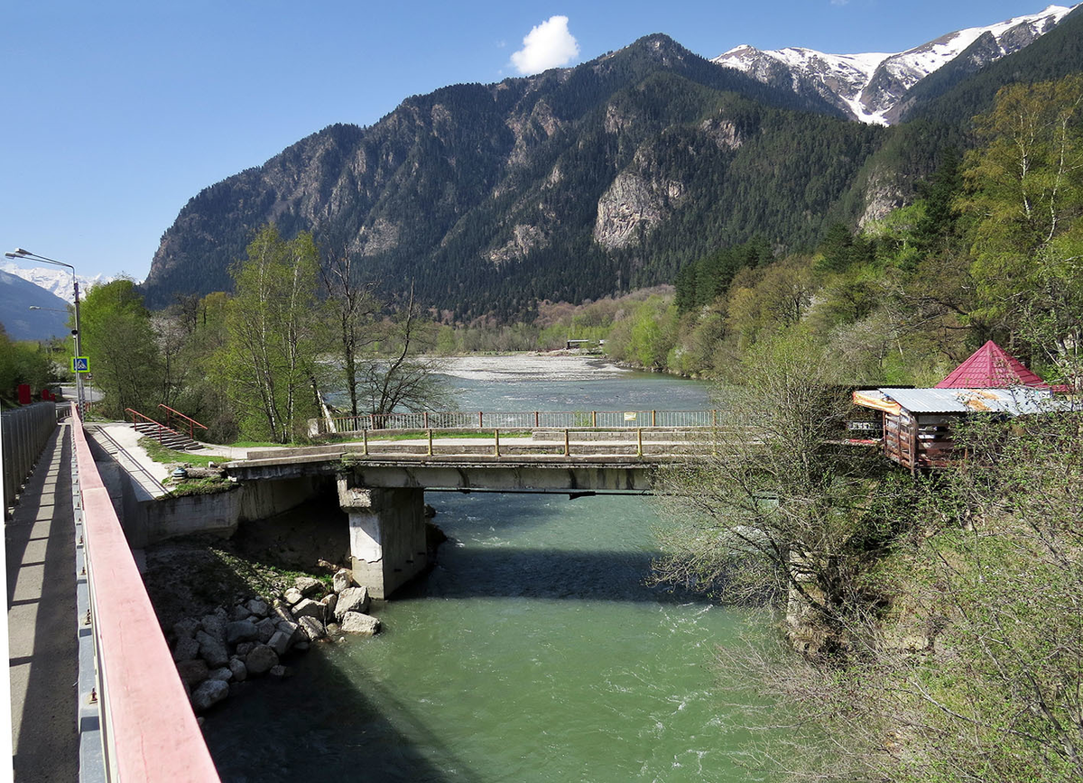 В центре длинной, но довольно-таки разреженной Теребды старая Военно-Сухумская дорога выводит на берег Самой Синей Реки, как иногда называют Теберду иносказательно: