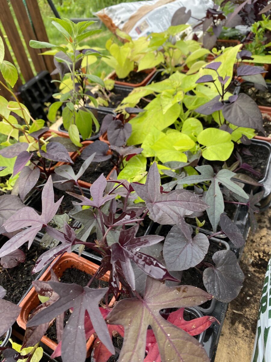 Решила сделать паузу в черенковании своих ипомей батат. Часть непроданных растений отправила в кашпо, так как в этом году я "сапожник без сапог" - не успела вовремя высадить цветы для себя. Теперь вот нагоняю упущенное. Эти цветы потом выкопаю, и буду хранить зимой корневище-клубеньки. А из новых укорененных черенков планирую к осени вырастить маточные растения, которые будут зимовать в доме на подоконнике. Посмотрю, какой способ хранения даст к весне лучший результат в виде зеленой массы для черенкования. В первую очередь высаживала более красивые и удачные черенки, это уже остатки. На фото ниже еще видны укорененные черенки сальвии мучнистой, с ними я уже решила прекратить возиться вплоть до следующей весны (поэтому и выглядят неприглядно - должны были засохнуть, но дождик оживил). В продаже она не очень, так как однолетник в нашем климате, но мне очень нравится (ее цветение), поэтому так же, как и с ипомеей, буду сохранять зимой и корневища, и сами растения. Для себя у меня растен