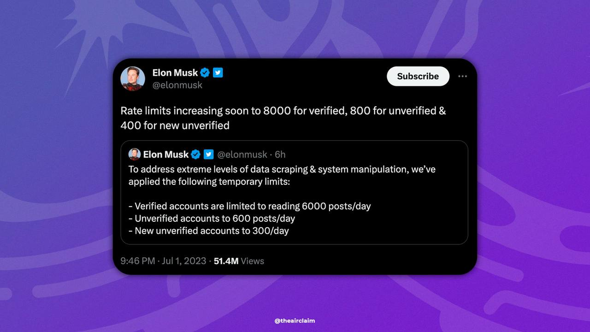 - 400 твитов в день для новых неверифицированных аккаунтов *Ранняя версия анонсированных ограничений: 6000 / 600 / 300 Какие конкретные действия нужны для получения AirDrop? Все необходимые шаги и актуальные рекомендации мы регулярно публикуем в нашем Telegram-канале 🚀 #twitter#elonmusk#новости#airclaim#airdrop#retrodrop#crypto