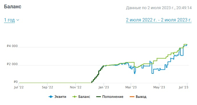 Приветствую Вас всех, на моем сайте, ну что поехали. Один счет у меня остался в живых, от компании Forex4you и этот счет рублевый, только как центовый, но копеечный Начал я пополнять его с 6 декабря 2022 года. И примерно пополнил на 2 тыс руб. И у меня уже на счету 4410 руб., прирост за год составил 136%. Я считай это отличный результат на форексе. Я не пытался просто на всю торговать и увеличивать в разы депозит. Я торговал, умерено, потихоньку, на дневном таймфрейми и помогал мне советник, но я его контролировал. Буду каждый месяц отчет публиковать, возможно подключу еще некоторые счета в отчет по форекс.
